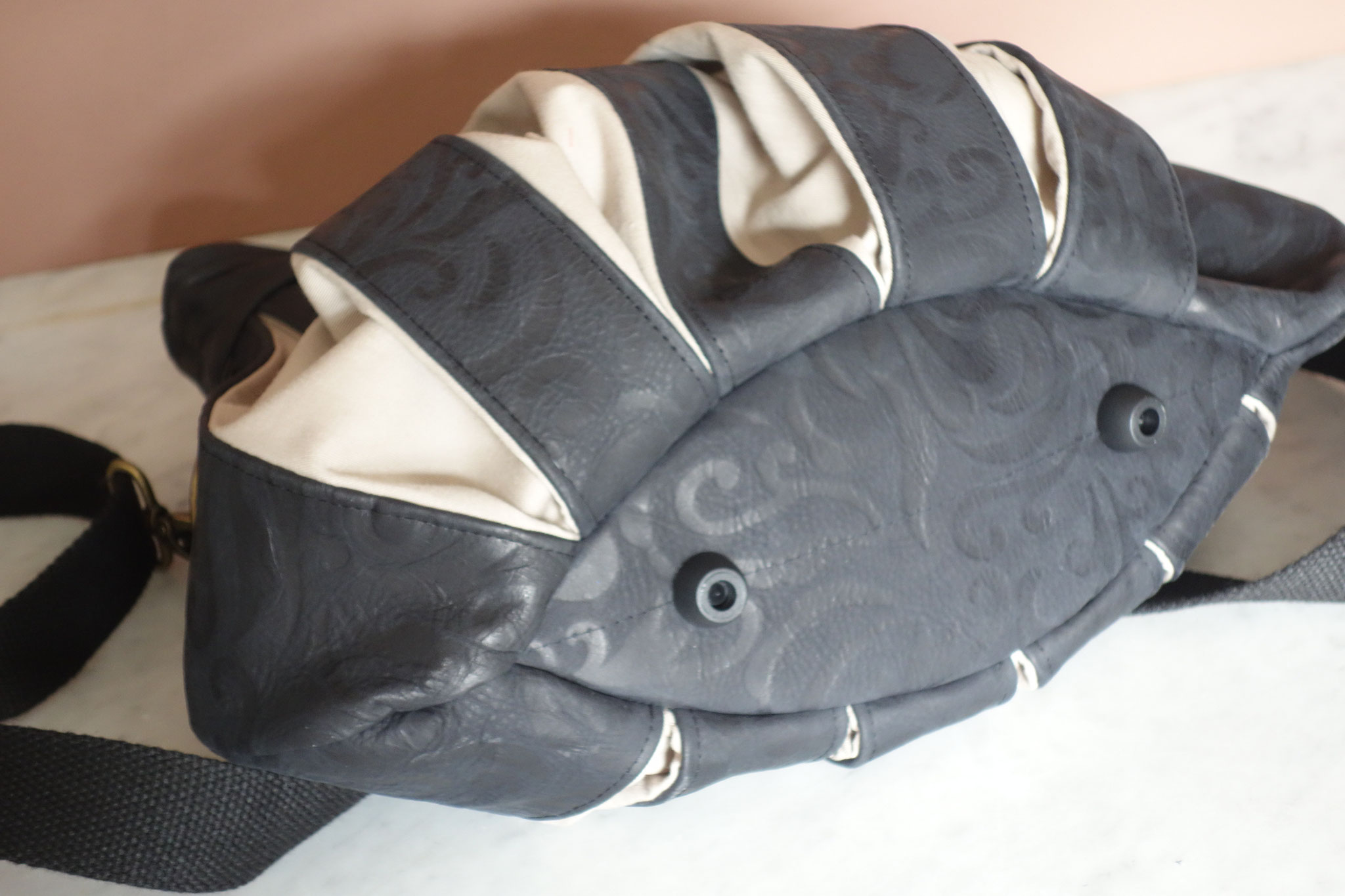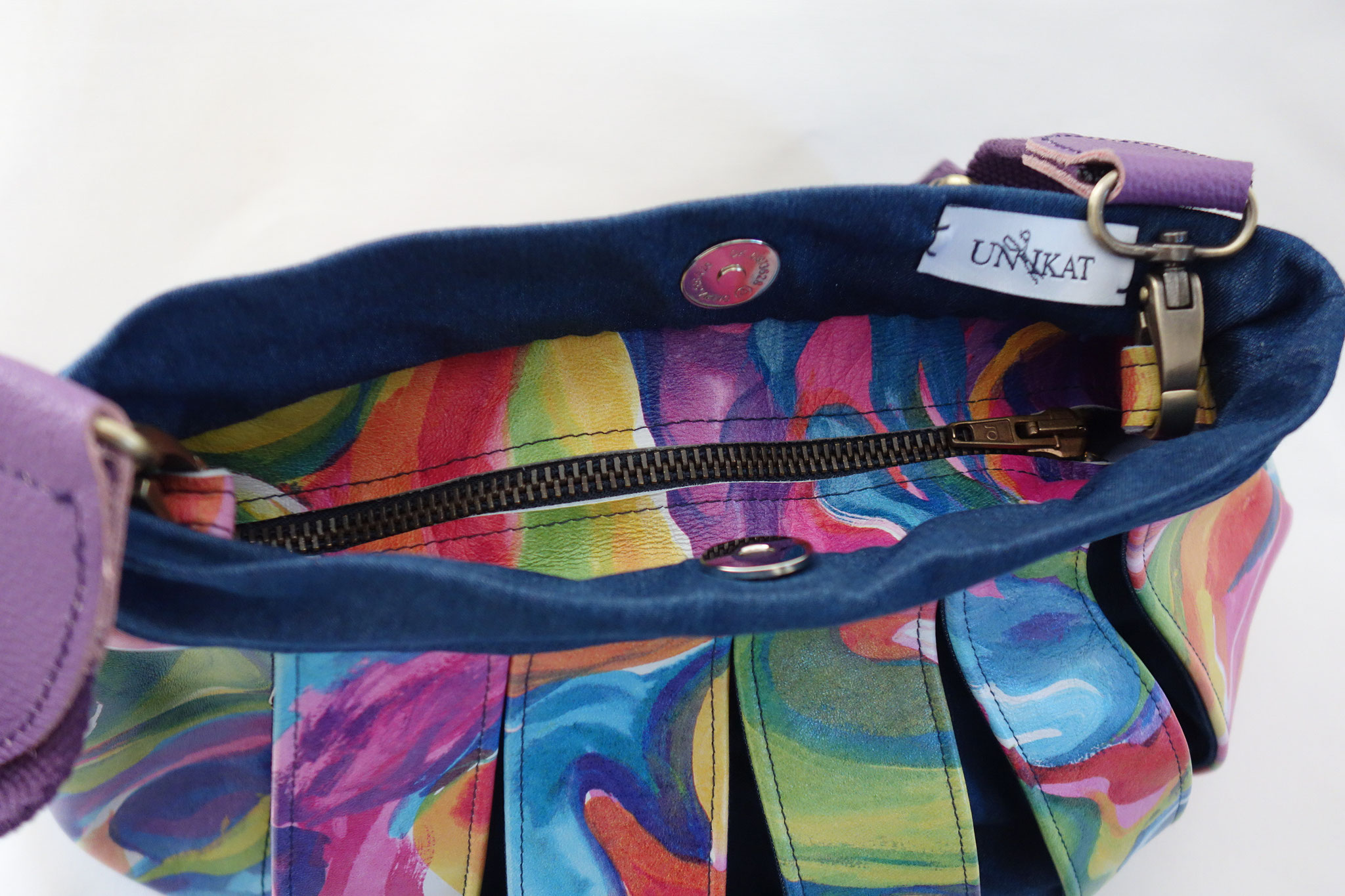 Jede Tasche ist ein Einzelstück mit unterschiedlichen Möglichkeiten im Außen- und Innenleben (z.B. Innentasche, Schlusselanhänger, Reißverschluss oder die Länge des Tragebandes…)
